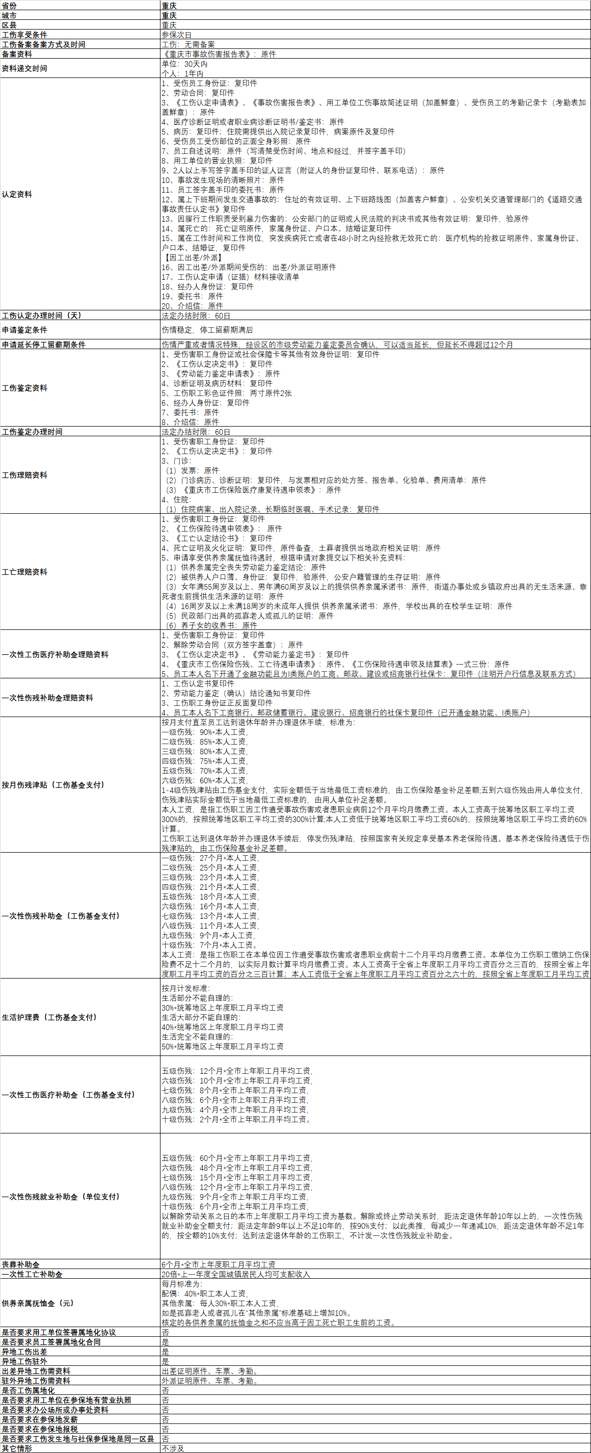 重庆工伤政策一览表